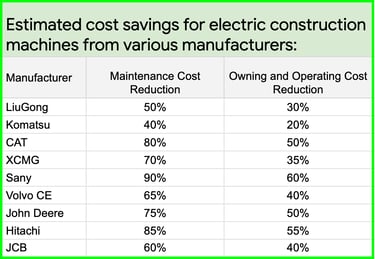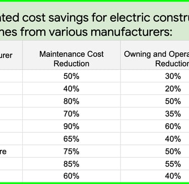 Using data retrieved from manufacturer websites, the internet, and Gemini AI, this table compares the estimated savings between electric and diesel construction equipment. Every source contains numerous assumptions. I kept my attention on MCR and O&O. These percentages will likely become more precise as the number of electric machines deployed grows.