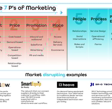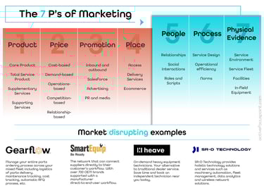 To keep it simple, I built an illustration of the 7Ps service marketing model and included some current disruptive examples in the heavy equipment dealership world. The model, introduced in 1981, (Pervaiz), has successfully created sustainable advantages for many organisations (Rebaz et al.).